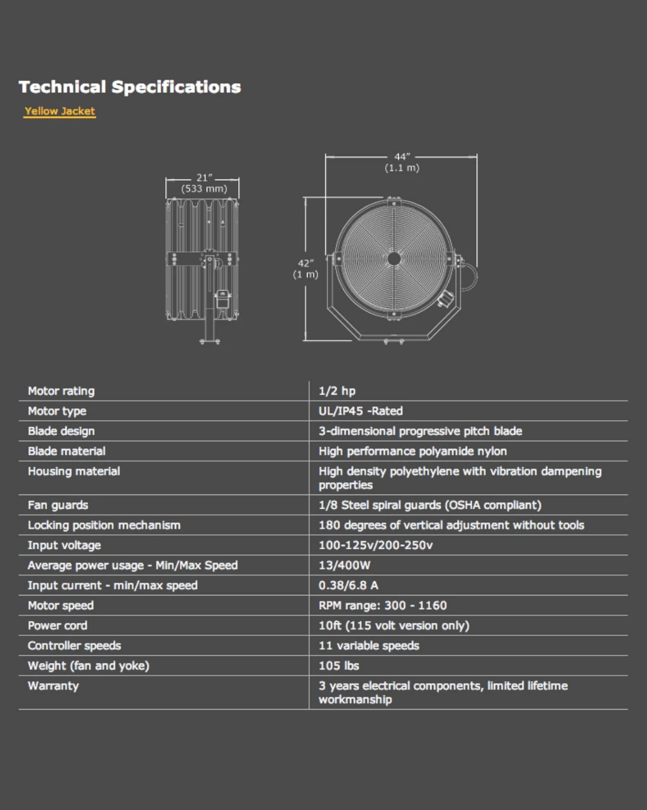Cool off your CrossFit or training facility with this smashingly durable, quiet, and portable Big Ass Fan® from Rogue. The Yellow Jacket takes abuse and stays in use with a heavy-gauge steel carriage that can withstand the toughest environments. An easily transportable pedestal directs airflow wherever the facility needs it. The cooling effects from this smaller Big Ass Fan can be felt up to 140 feet away. Small, mighty, and quiet. Yellow Jacket’s tight construction and efficient airfoils ensure it will not drown out conversations – even nearby.