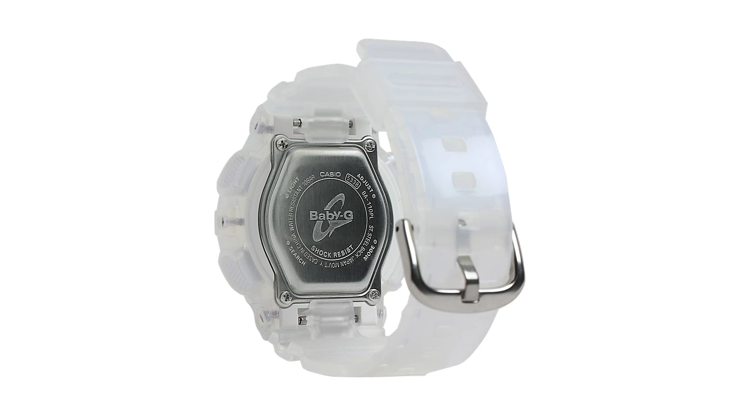 Based on a theme of trendy polarized multi-color designs, the Women’s G-Shock BA110PL-7A2 sports watch, aka “Baby G,” features a skeleton resin construction in a compact, lightweight format.