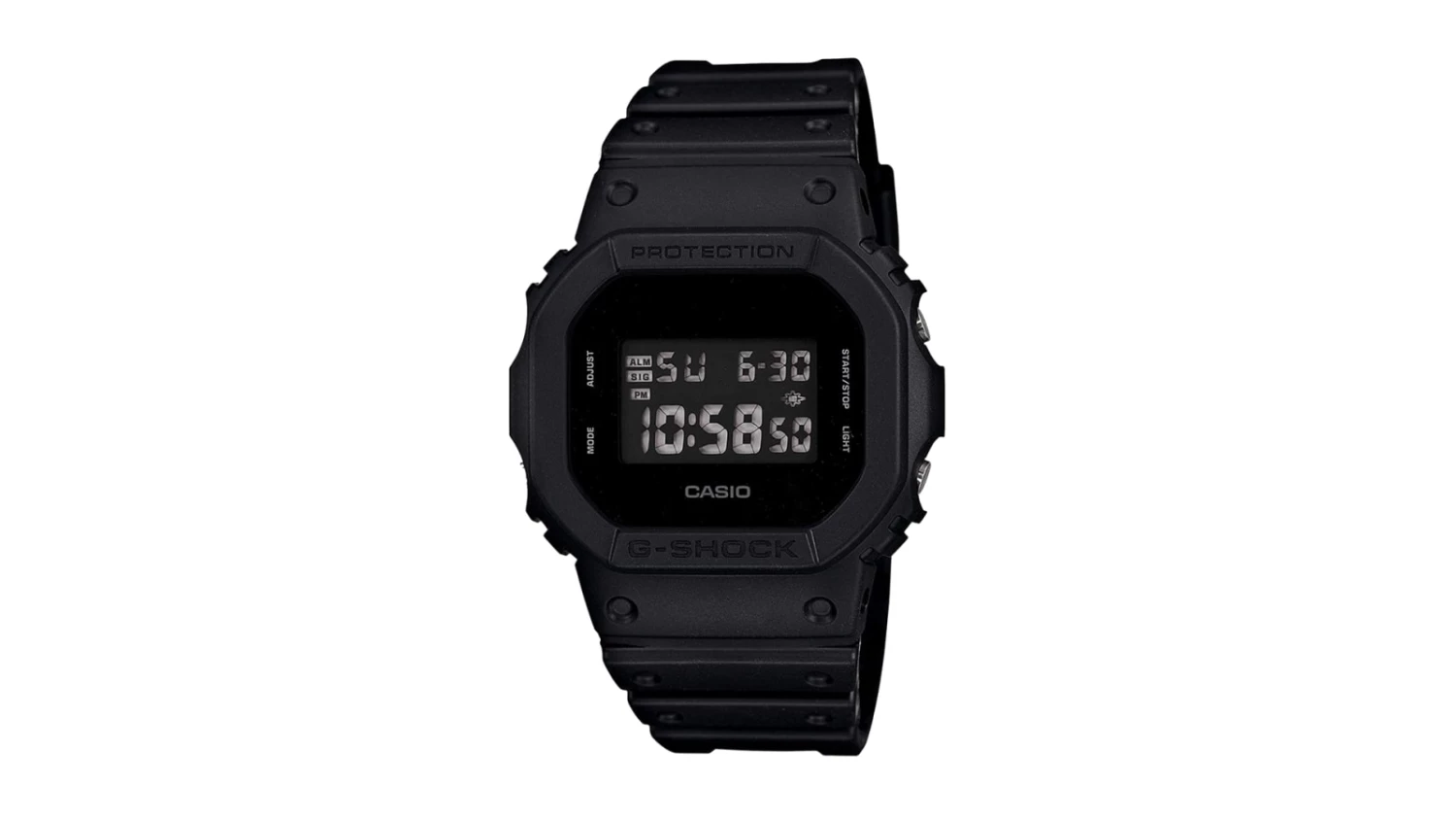 This new, no-frills take on the G-Shock DW5600 case features a monotone black-on-black design with a matching backlit LCD display, creating a sleek tactical look.