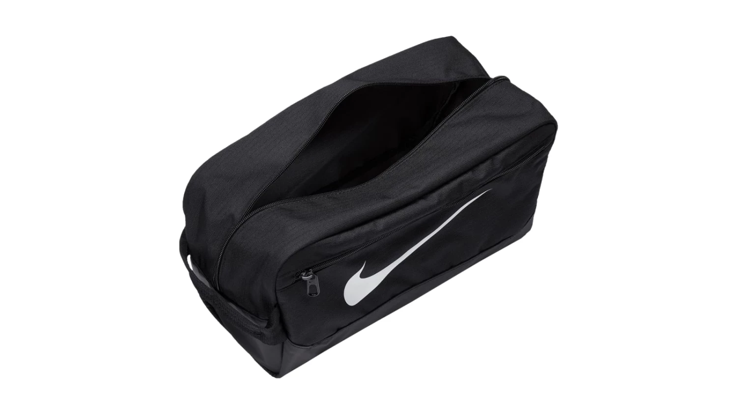 The Brasilia Shoe Bag is made from a durable, 100% Polyester material and is available here in black with Nike branding.