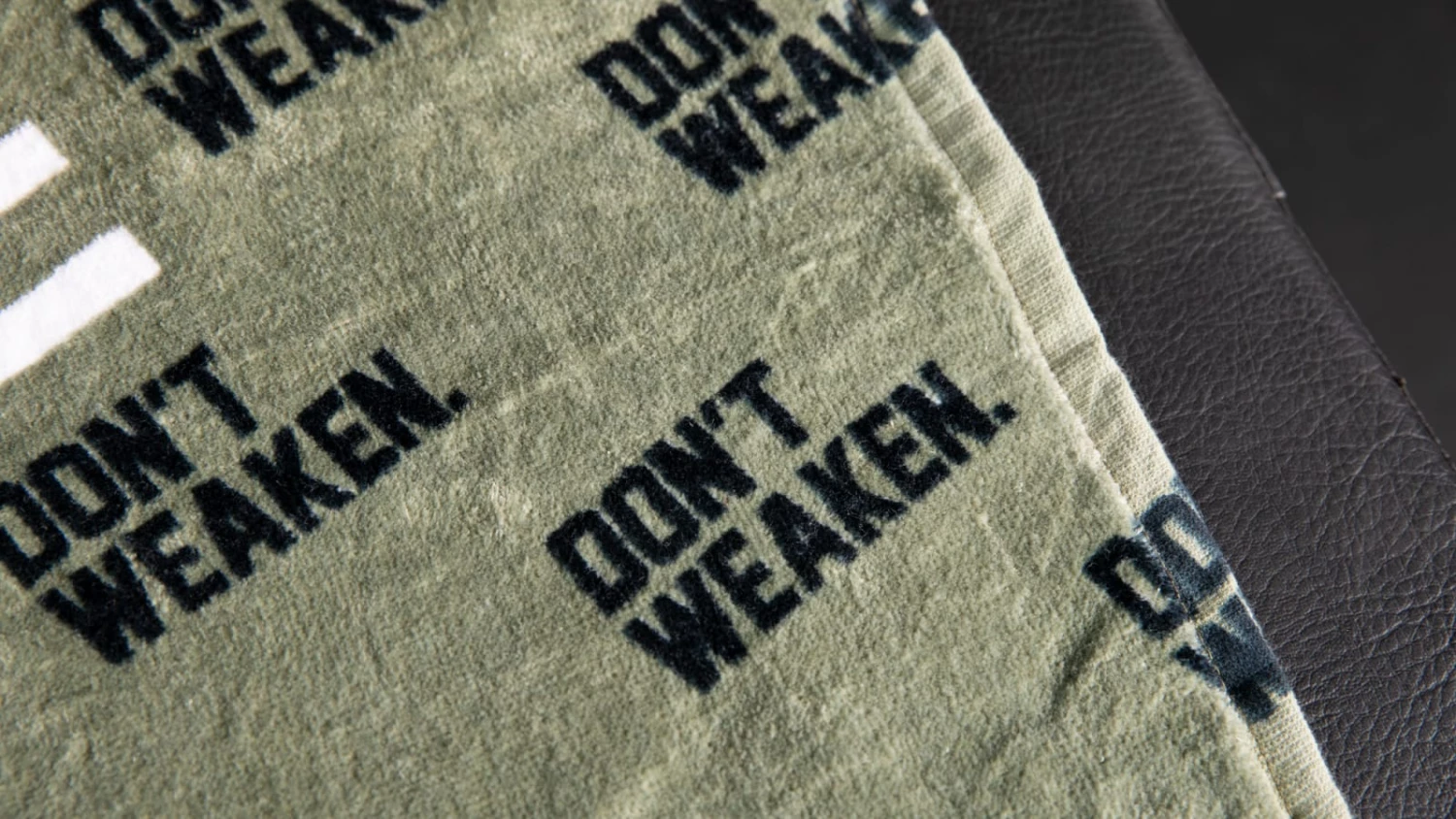 Rogueβs βDonβt Weakenβ Gym Towel measures 17.75β x 31.5β and is made from a quality 100% cotton velour material. Stays soft through repeated uses; machine wash cold with like colors, tumble dry low.