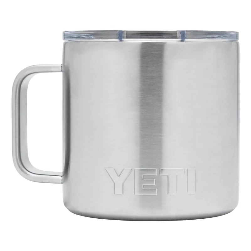Available here in Stainless Steel with exclusive Rogue branding, the 14-oz YETI Rambler is the ultimate, all-purpose camp mug, ideally suited for transporting coffee / tea / cocoa, as well as soup / chili / oatmeal, etc. The double-wall, vacuum insulation and seal tight lid keep the contents safe and insulated, while also keeping your hands safe from the contents.