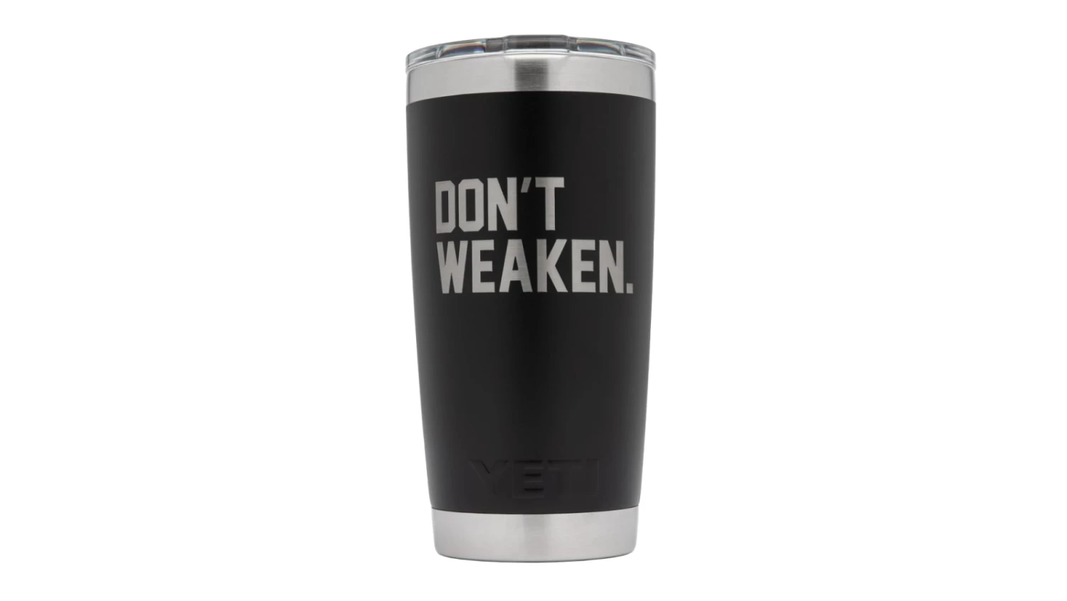 This tumbler is available in a duracoat Black finish with the Rogue logo on one side and Terry Todd’s motivational โDonโt Weakenโ slogan on the other.